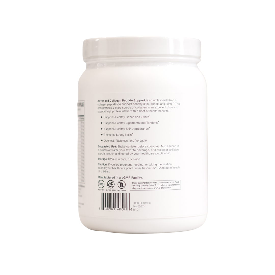 Advanced Collagen Peptide Support is an unflavored blend of collagen peptides to support healthy skin, bones, and joints. This concentrated dietary source of collagen is an excellent choice to support high protein intake with a host of health benefits including: