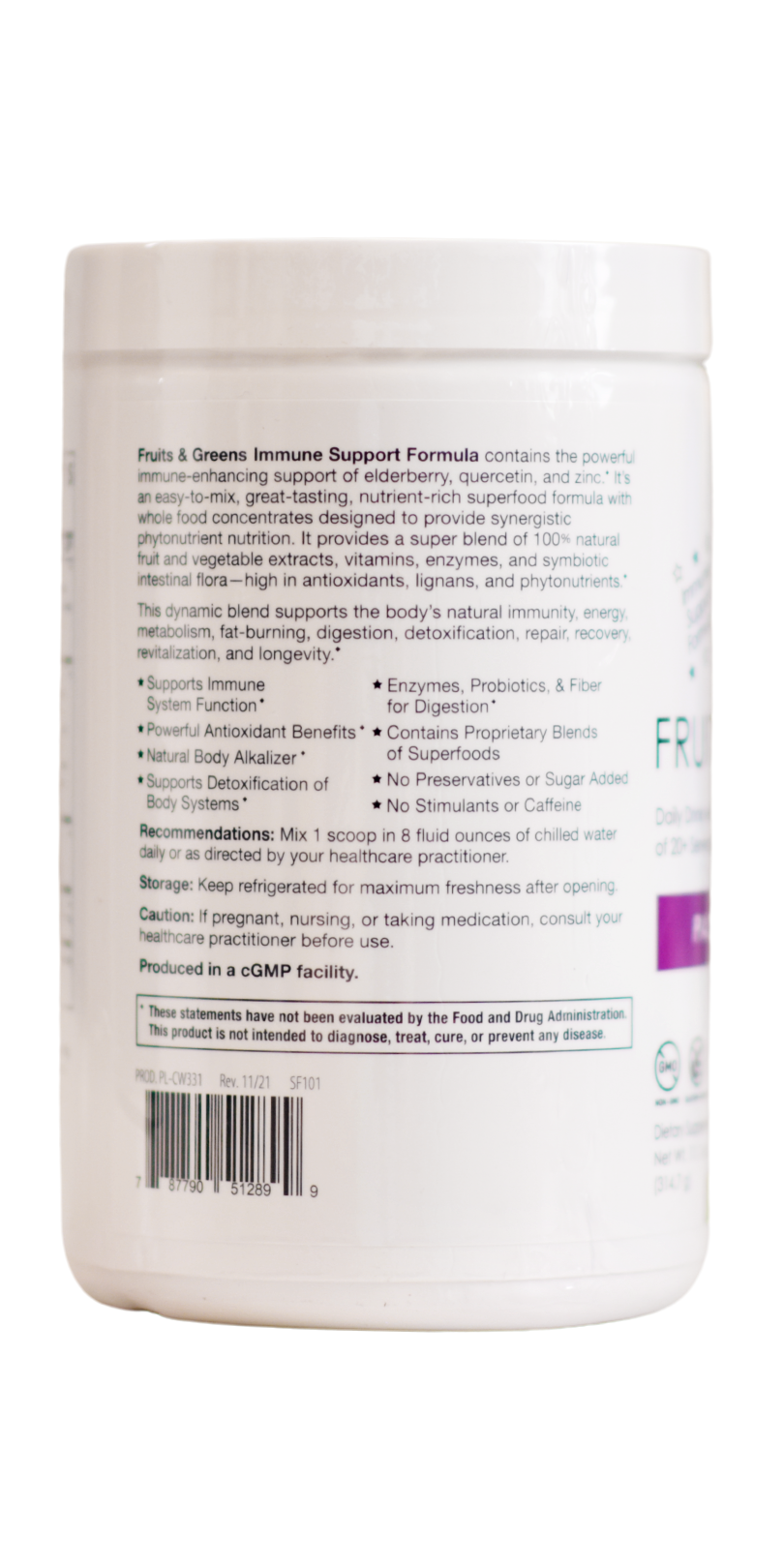NutriDyn Fruits & Greens is an easy-to-mix, great-tasting, nutrient-rich superfood formula with whole food concentrates designed to provide synergistic phytonutrient nutrition. It provides a super blend of 100% natural fruit and vegetable extracts, vitamins, enzymes, and symbiotic intestinalflora— high in antioxidants, lignans, and phytonutrients. This blend supports the body’s natural energy, metabolism, fat-burning, digestion, detoxification, immunity, repair, recovery, revitalization, and longevity.